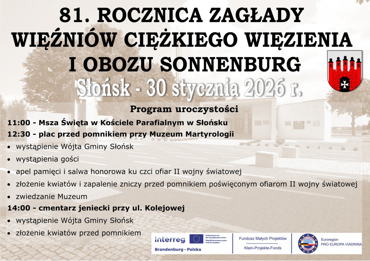 W piątek 30 stycznia 2026 r. w Słońsku odbędą się obchody 81. rocznicy zagłady więźniów ciężkiego więzienia i obozu Sonnenburg. Uroczystości mają charakter pamięciowy i edukacyjny oraz stanowią okazję do wspólnej refleksji i oddania hołdu ofiarom tragicznych wydarzeń II wojny światowej. Szczegółowy program obchodów dostępny jest na plakacie wydarzenia.